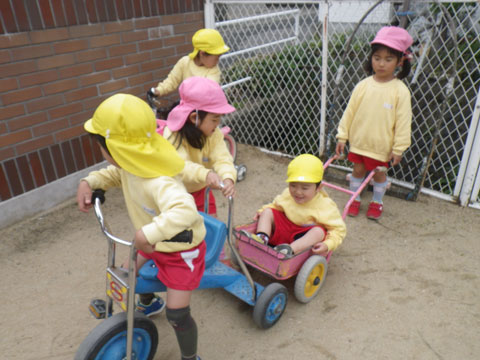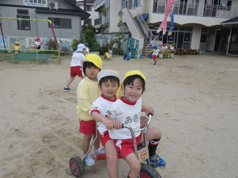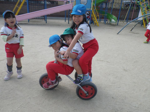 3人乗りに挑戦する果敢なチャレンジ精神を持つ年長児