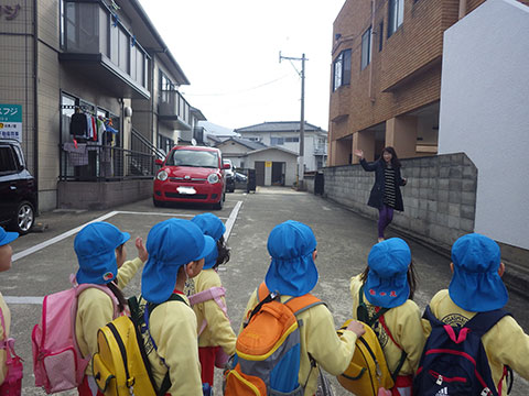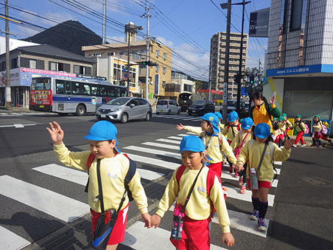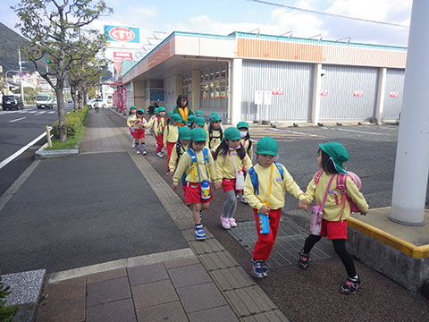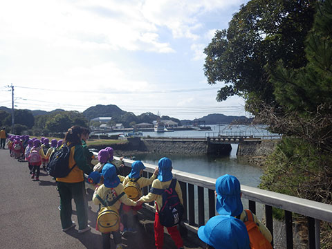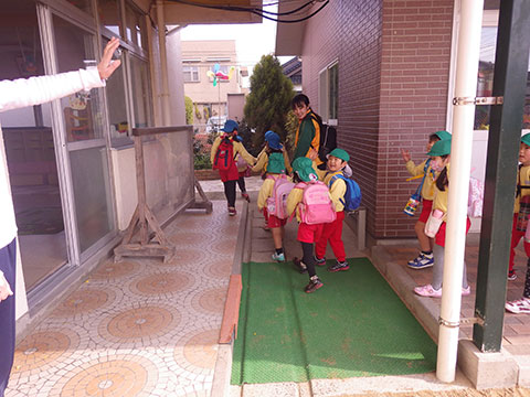 「いってきまーす!!」年長児は約4キロの道のりを徒歩で向かいます