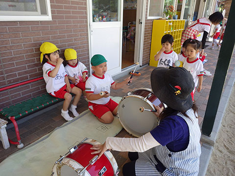 マーチングの練習をがんばる年長児を見つめる後輩たち。