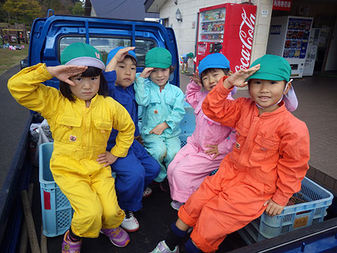つなぎを着ている園児たちが今日の芋掘リーダーです