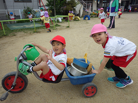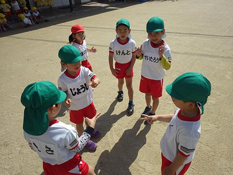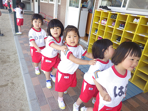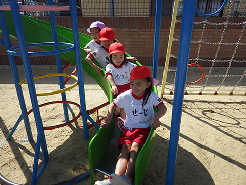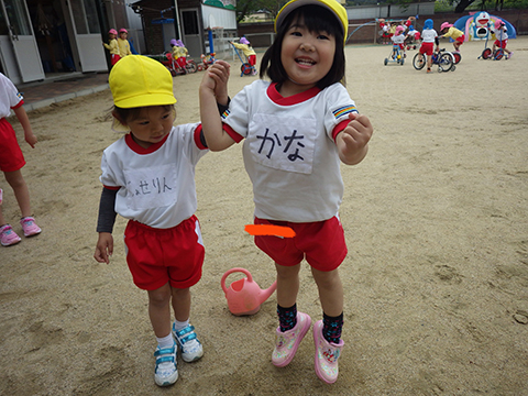 園庭では手を繋いで一緒にあそんでいます