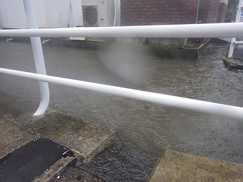 園の前もこうして水があふれてきたり、隣の川もこんなに大量