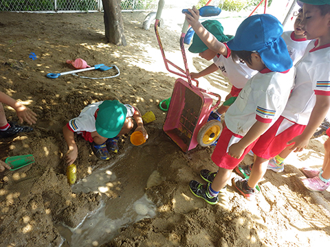 砂場での水を使った建設作業もはかどっています