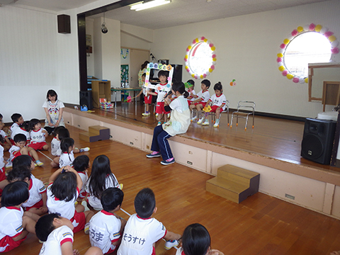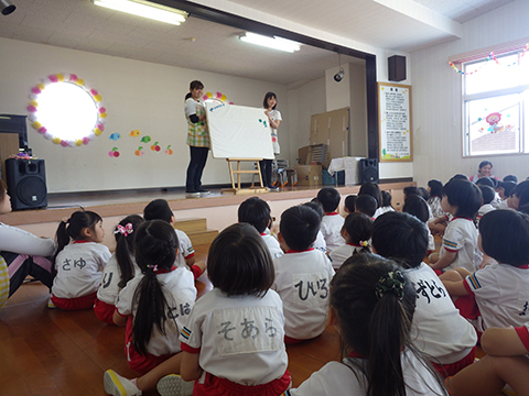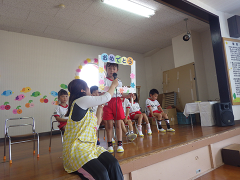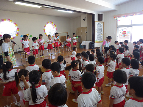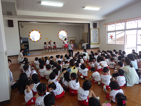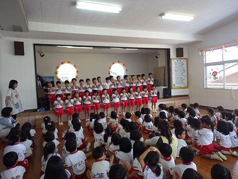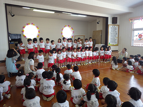 さて、本日は全園児おゆうぎ室に集まって誕生会