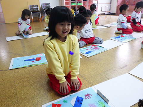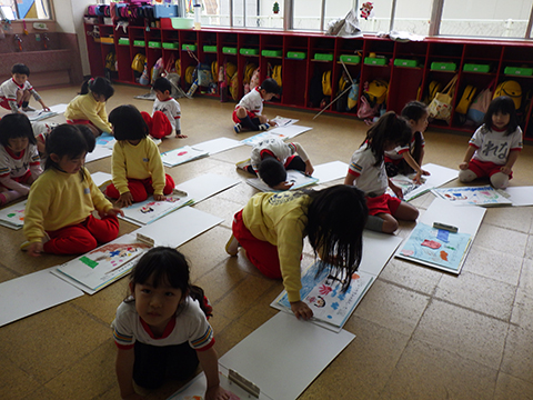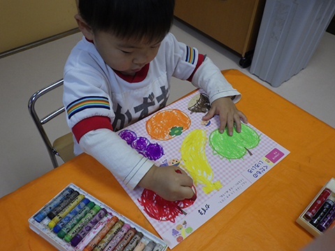 年少児、色塗りと年中児は自分の顔を貼りつけ