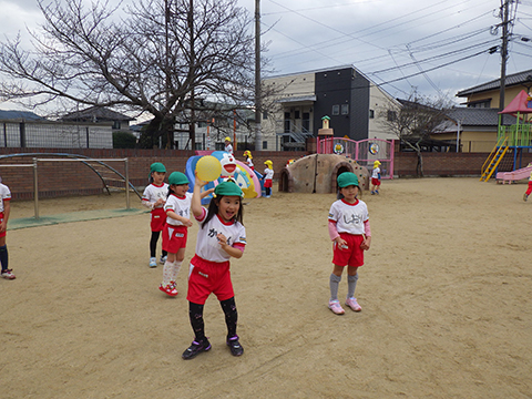 ジャケットを脱いでおゆうぎ室でドッジボール