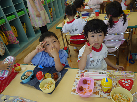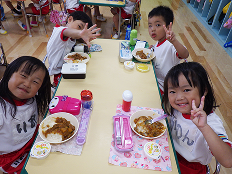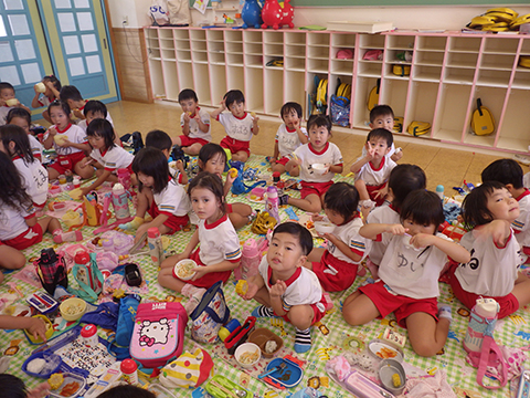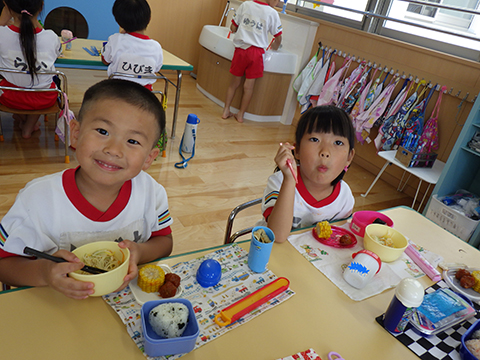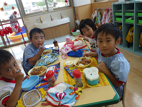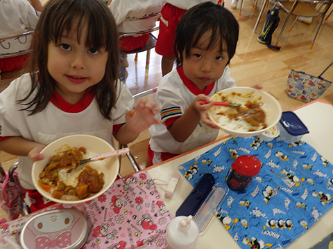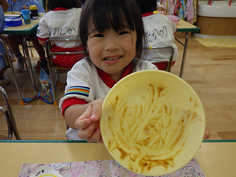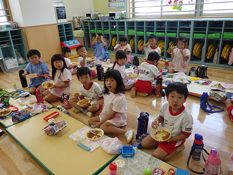 早く食べ終えた園児たちがゴミ袋を手に収集