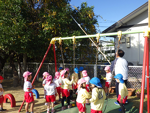 5メーターほどの長い棒を使って名人がミカンを捕獲。